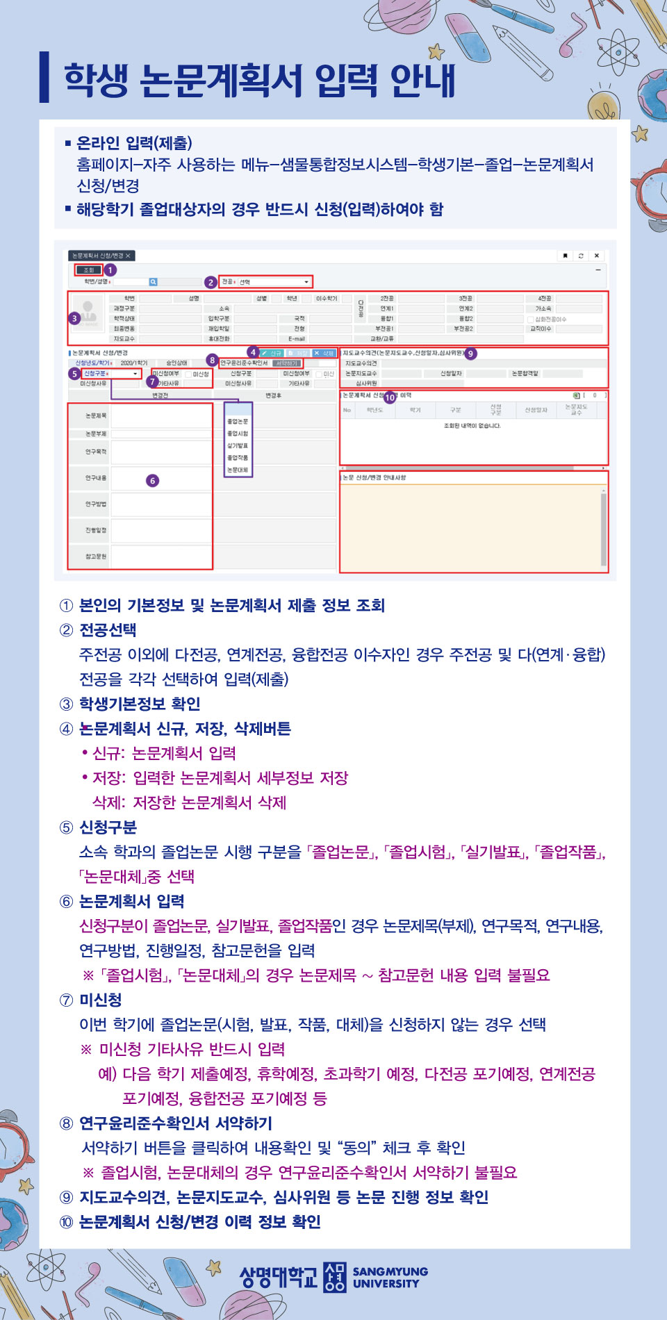 3. 제출(온라인 신청) 방법: 샘물포털시스템-통합정보-학생기본-졸업-논문계획서 신청/변경